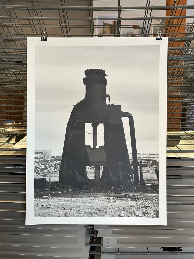 The object in this print is the Chambersburg 40000# steam driven forging hammer that operated for many decades at Kropp Forge in Cicero IL. In 2023 it was revealed, massive and immovable, as the facility was demolished around it. I got a lucky shot and then it was gone…not in fact sent to Canton (OH) but scrapped entirely.